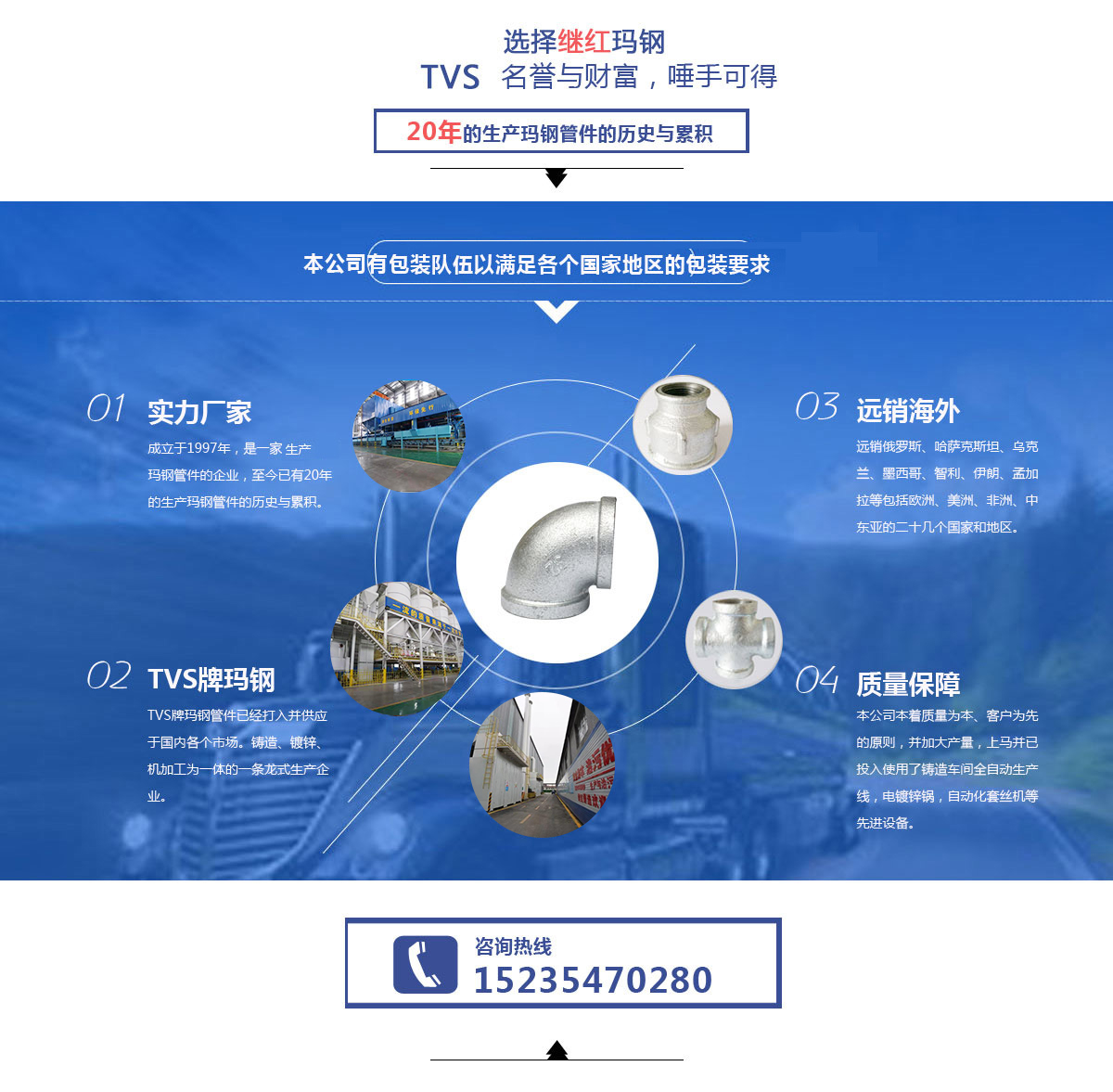太谷繼紅瑪鋼鑄造有限責(zé)任公司座落于山西省太谷縣胡村瑪鋼工業(yè)園區(qū),成立于1997年,是一家專業(yè)生產(chǎn)瑪鋼管件的企業(yè),至今已有20年的生產(chǎn)瑪鋼管件的歷史與累積。其中,本公司在出口外貿(mào)瑪鋼管件方面尤其專業(yè)并具有相當(dāng)大的優(yōu)勢,長年生產(chǎn)的德標(biāo)管件、美標(biāo)管件、英標(biāo)管件遠(yuǎn)銷俄羅斯、哈薩克斯坦、烏克蘭、墨西哥、智利、伊朗、孟加拉等包括歐洲、美洲、非洲、中東亞的二十幾個國家和地區(qū)。